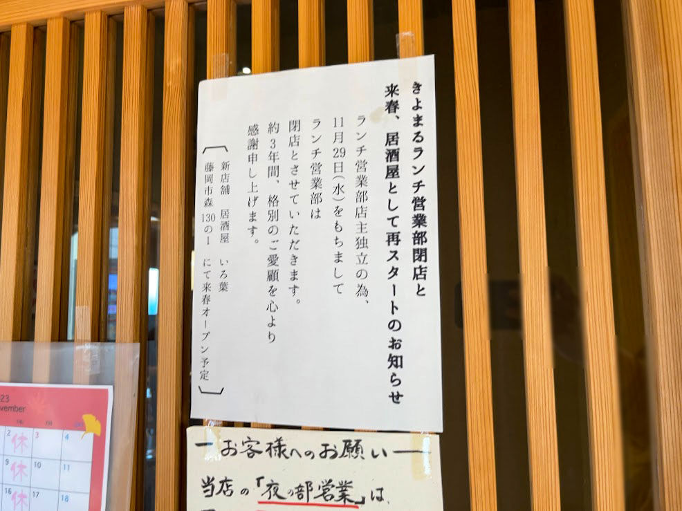 ラーメンの営業は、11月29日まで。